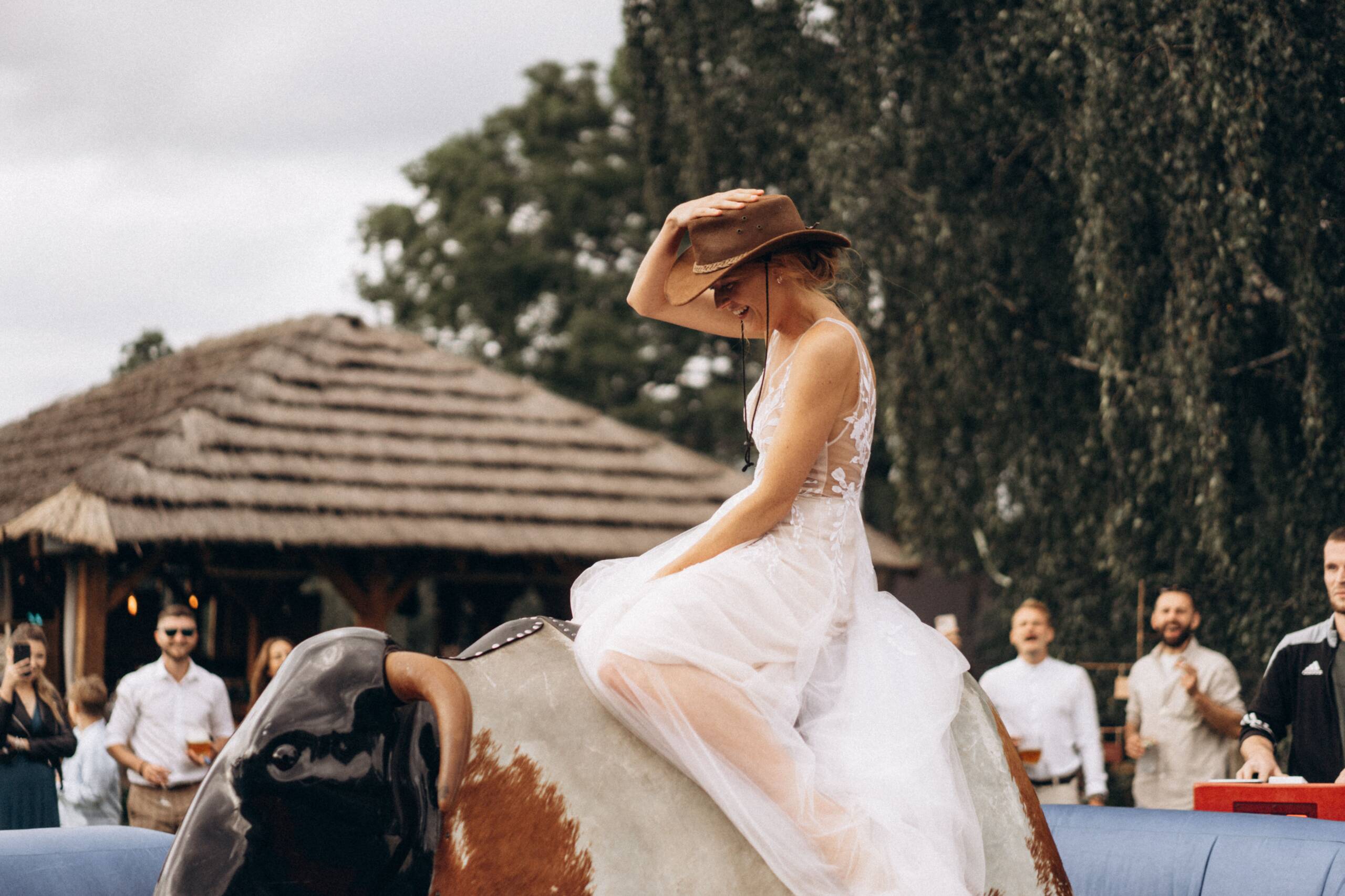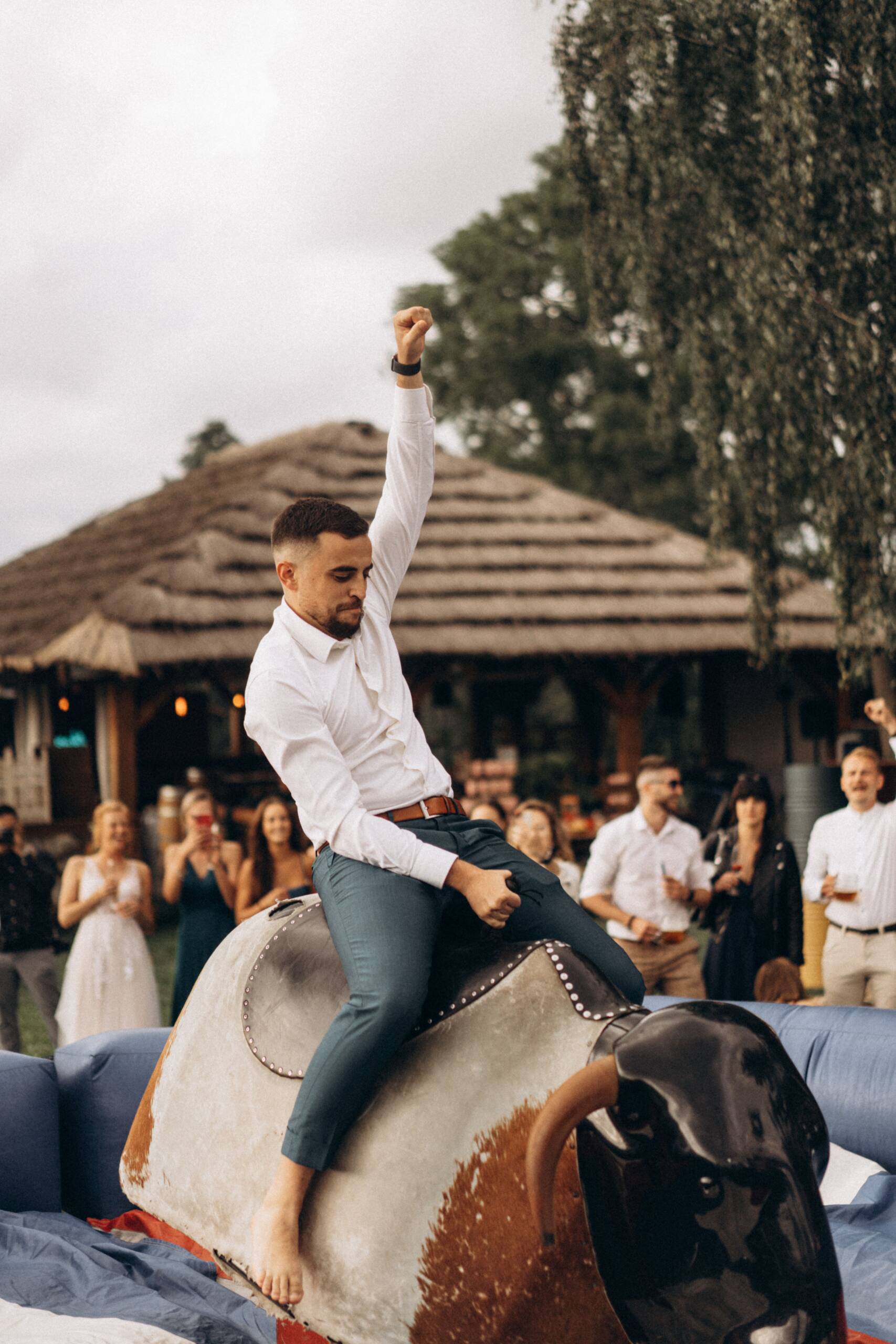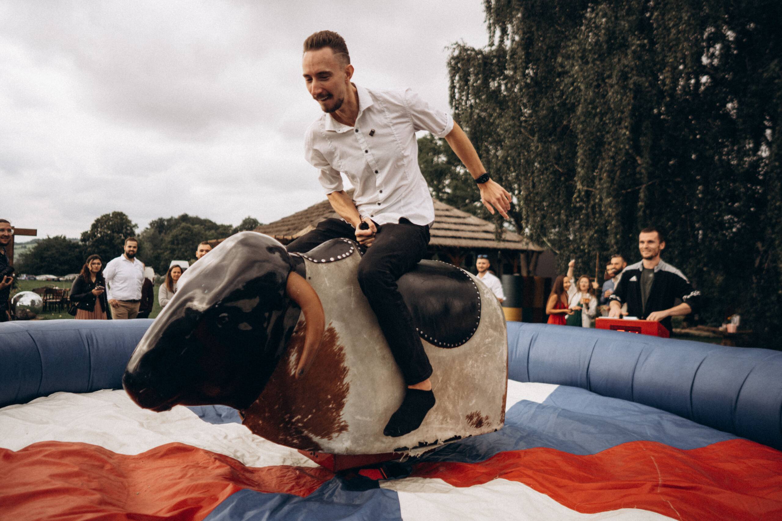 Jednou jsme měli mechanického býka, na kterém se svezli snad úplně všichni, včetně nevěsty v tylové sukni.😉 A víte co bylo nejkrásnější? Když se jí podařilo udržet se déle než ženichovi – celá louka explodovala smíchem a jásotem. Někdy plánujeme i stan s retro hrami – deskovky, co si lidé pamatují z dětství.😍 Kvízové kolo štěstí a dá se toho vymyslet stovky. Organizované turnaje v čemkoliv, v čem si jen umíte představit. Skákací hrady, klouzačky, no prostě všechno jde! A to všechno jsou ty chvíle, co dávají svatbě duši. Protože každá svatba má být jedinečná – a hry na svatbu jsou tím, co jí vdechne vlastní rytmus.