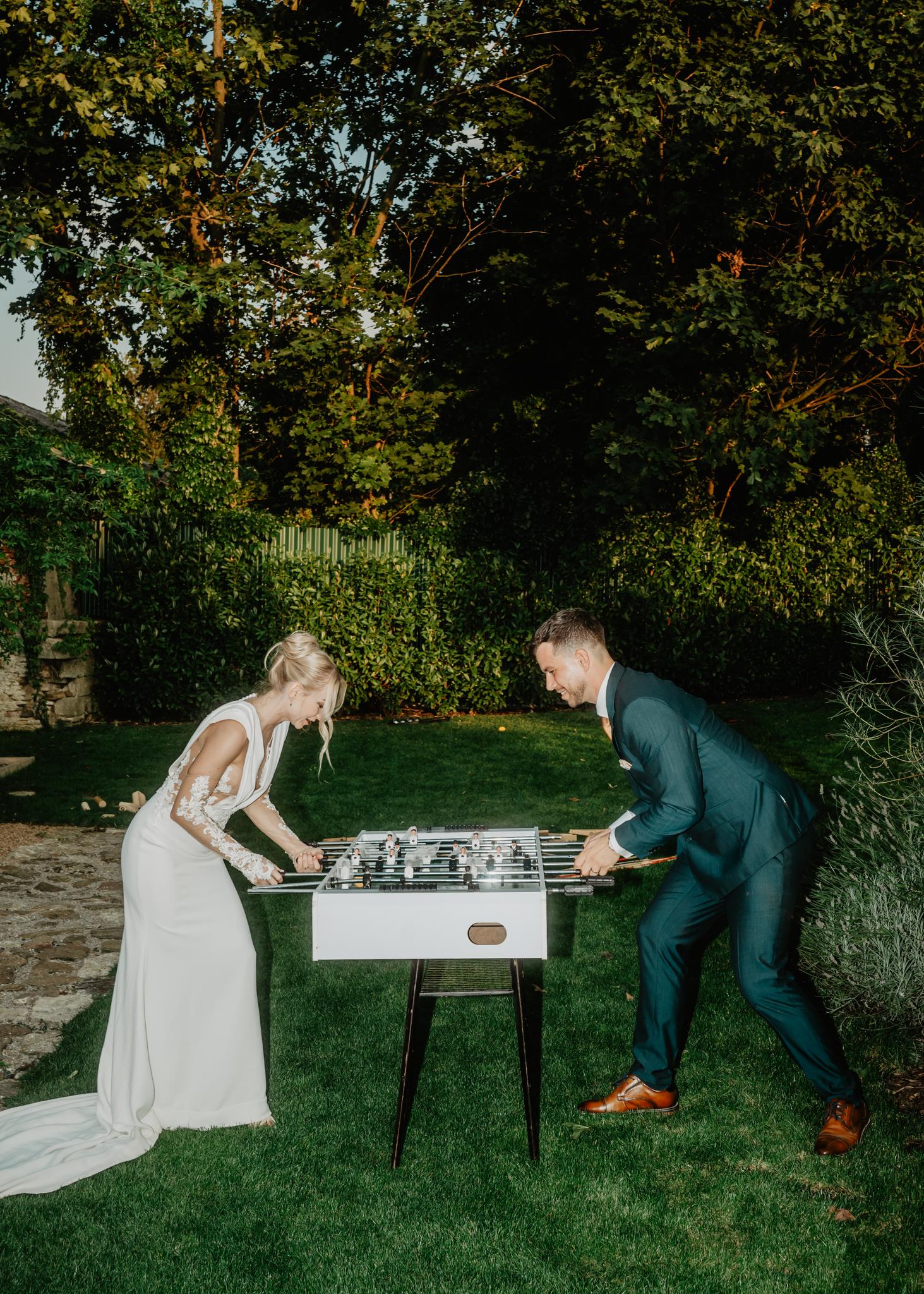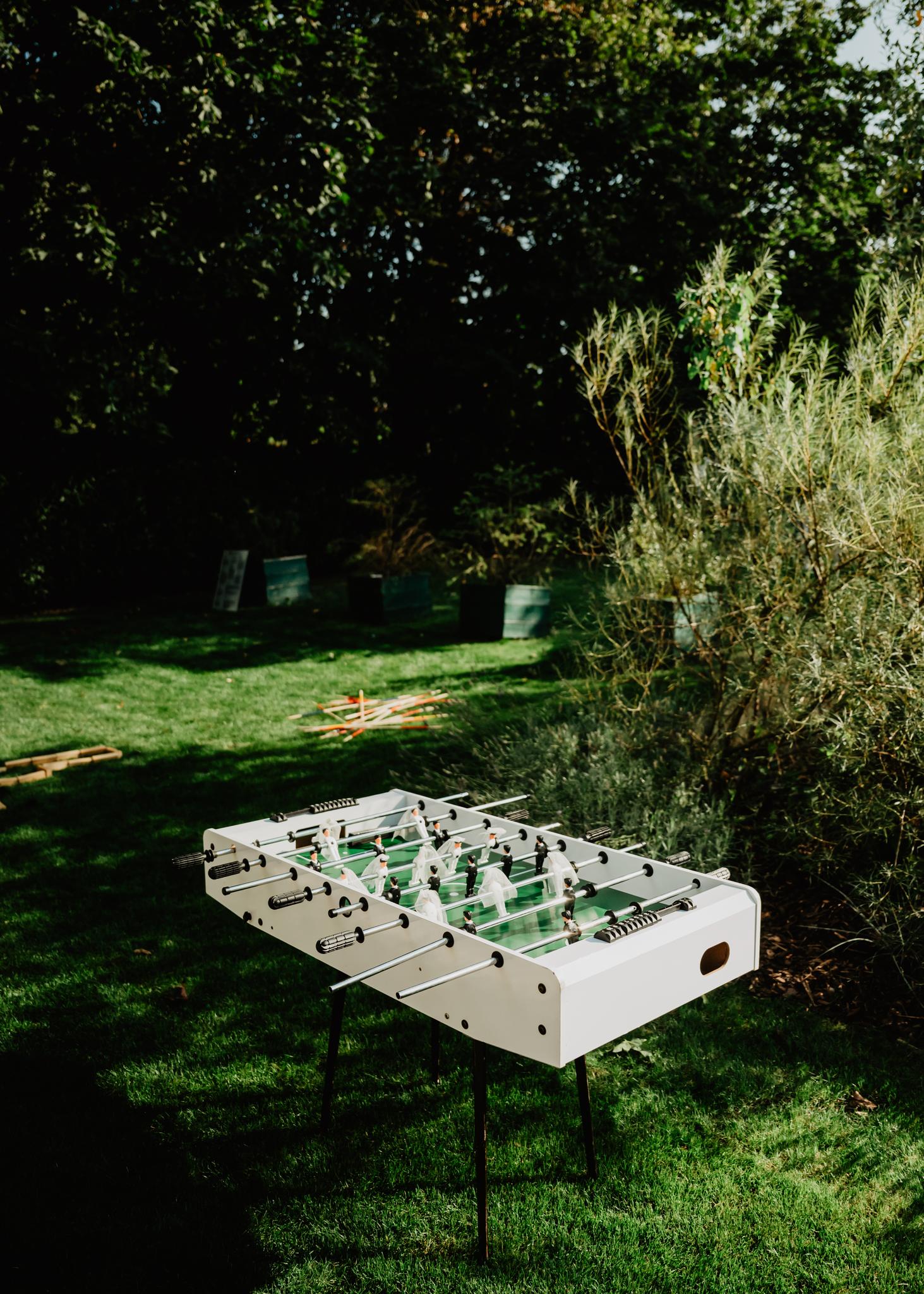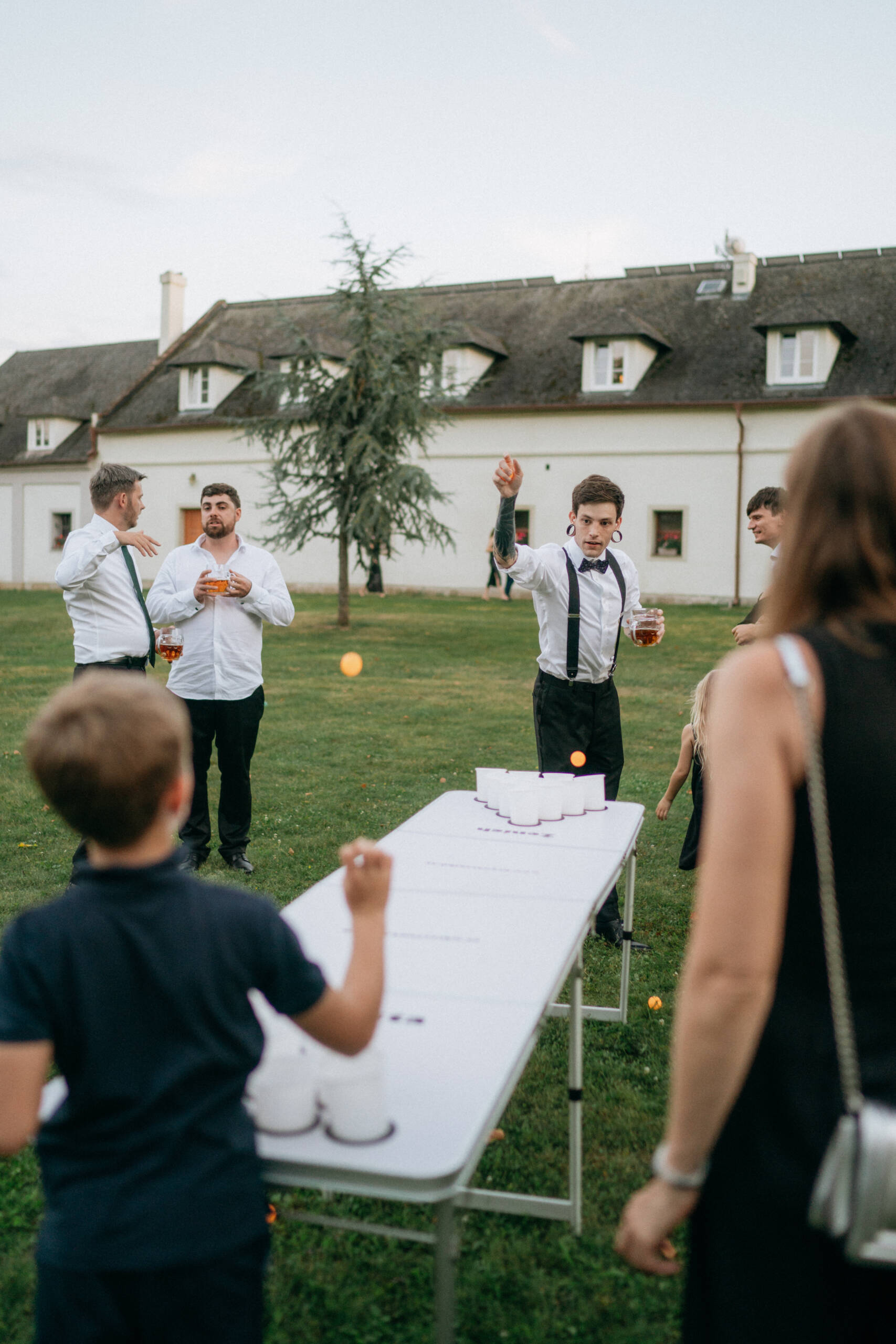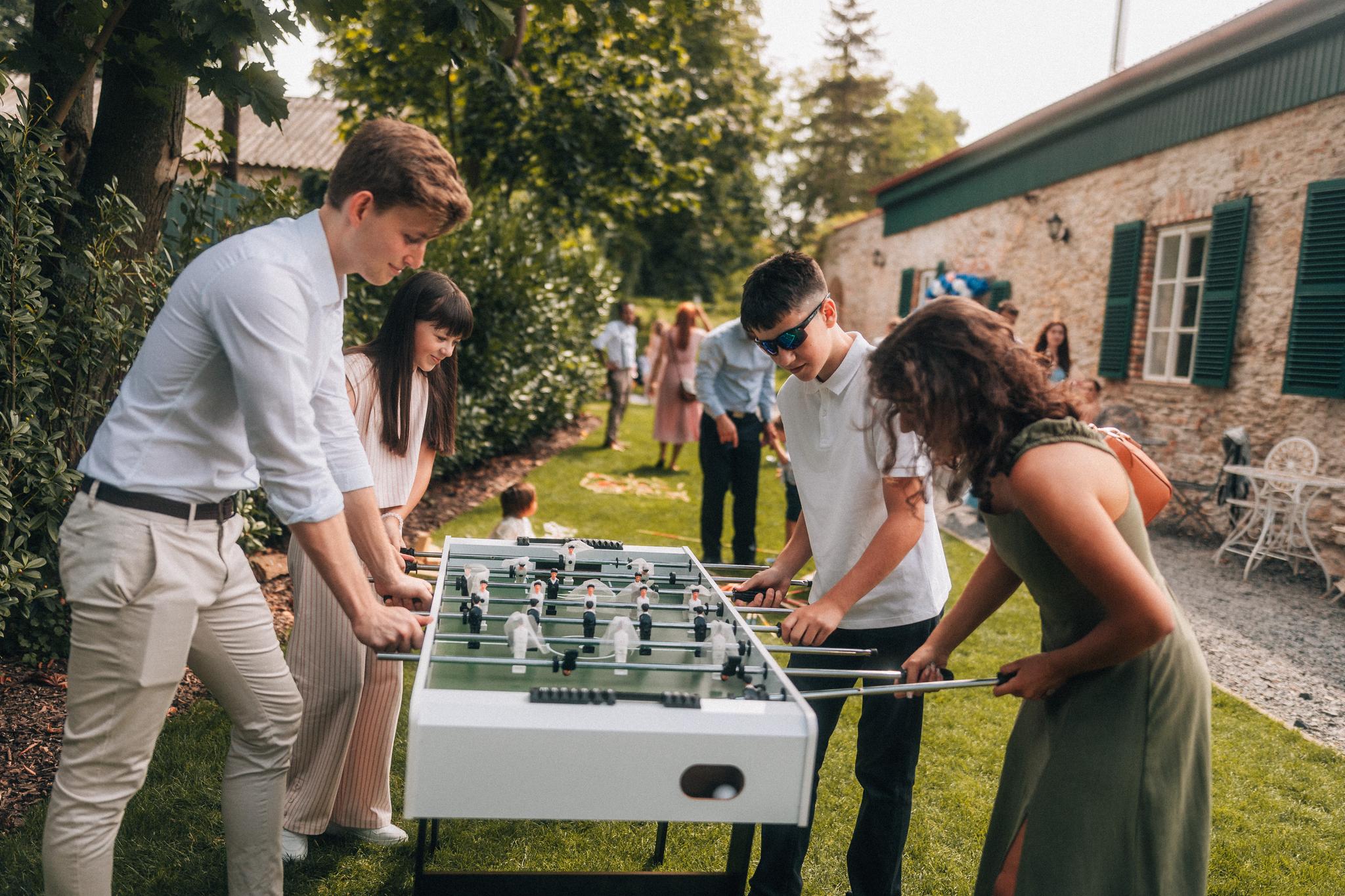 Jedna část těchhle radostí jsou hry hmotné. Fyzické, velké, barevné. Ty, co na vás mrknou už při příchodu na svatbu, a vy víte, že dneska to nebude jen o tom sedět a popíjet.😉 Máme rády, když se hosté mezi obřadem a hostinou nenudí – když si můžou jen tak z hecu pinknout ping pong, zahrát si croquet mezi stromy nebo si sednout k beer pongu s někým, koho vidí poprvé.